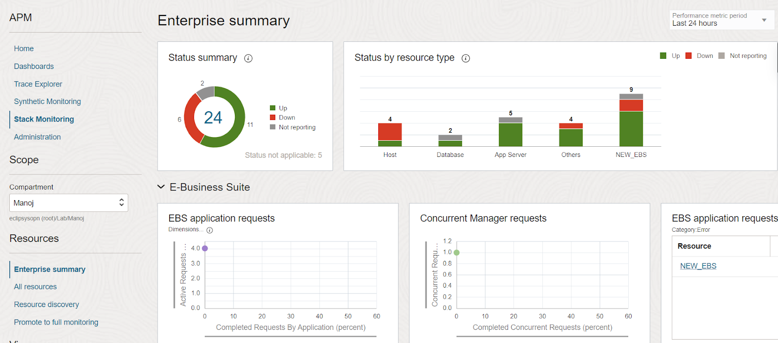 Stack Monitoring provides discovery and monitoring of an application including its underlying resources whether application is running on-premises or on OCI.