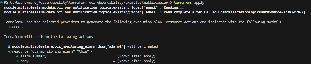 terraform apply = to apply the code and create the alarms. (showing the partial output below)